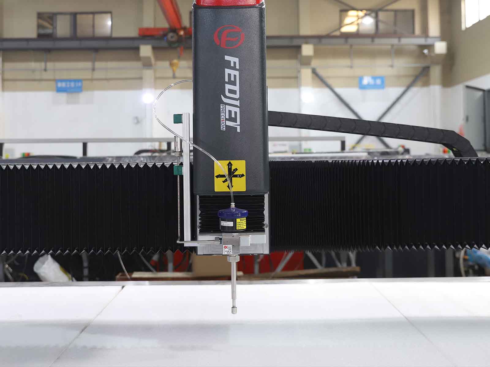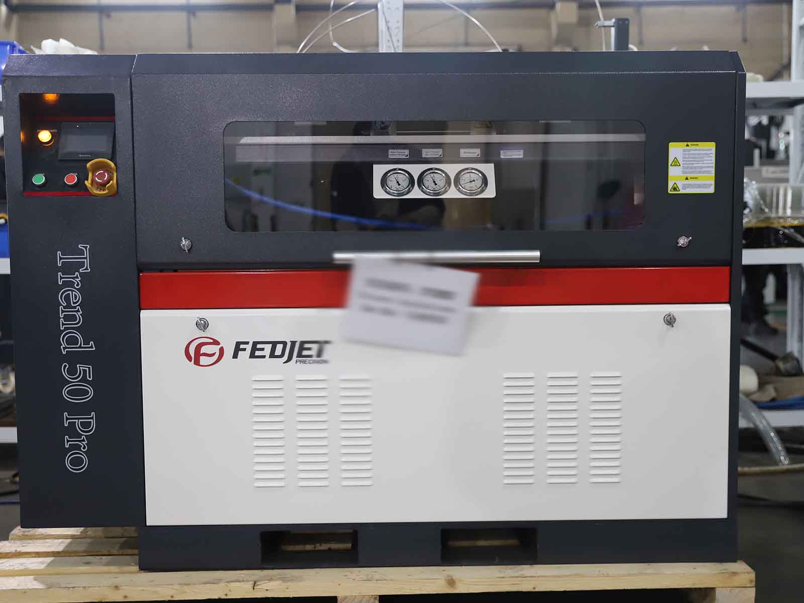 Engineered to meet the client's specific production requirements, this robust system integrates top-tier components with Fedjet's proprietary technology. The core cutting assembly utilizes a precision KMT cutting head, renowned for its durability and accuracy. This is powered by Fedjet's patented high-pressure intensifier pump system, ensuring consistent power and cutting performance.